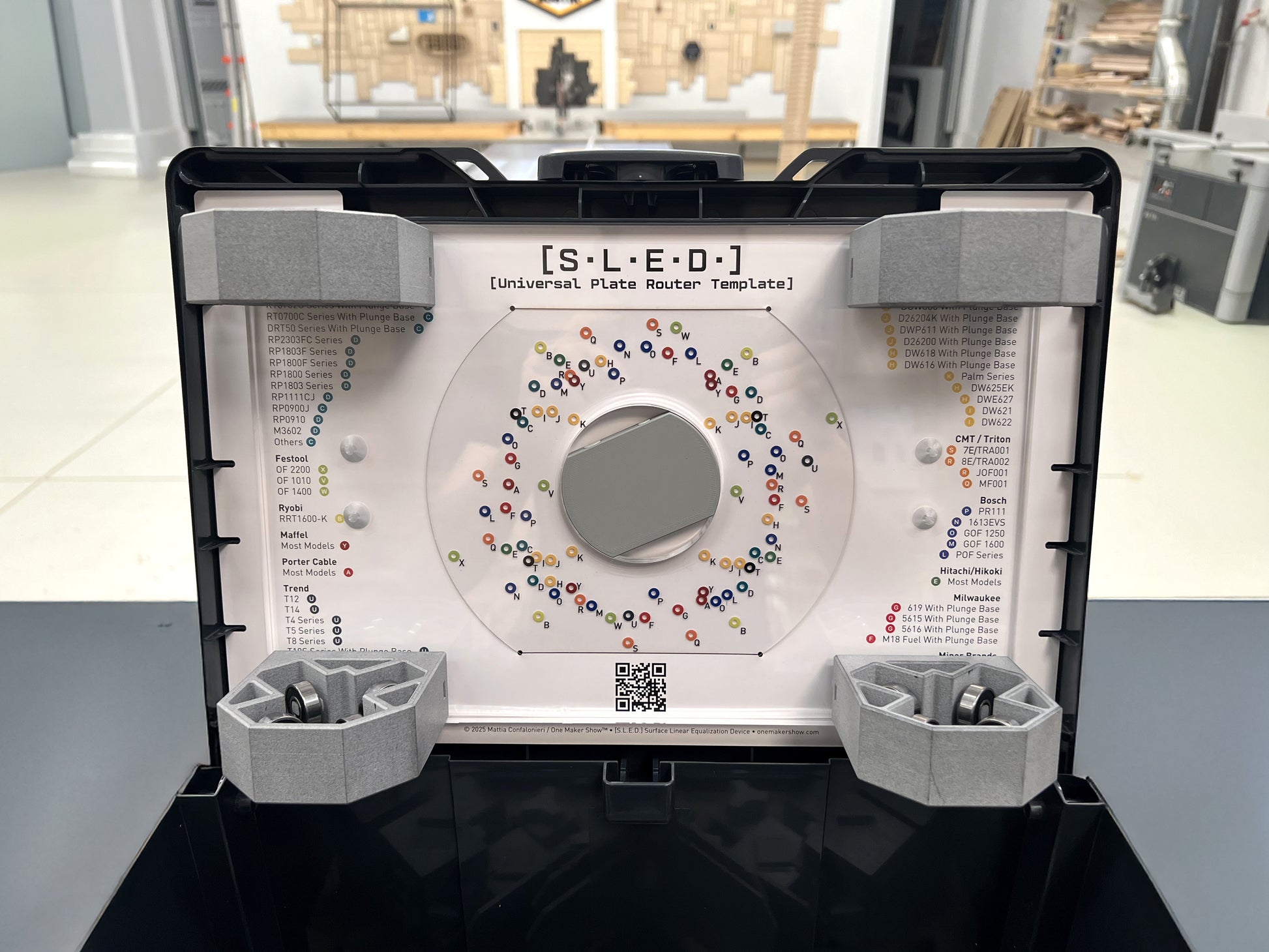 It’s not possible to give a minimum footprint, as it depends on the router bit used. As a general rule, subtract about 30 cm (11 in) from each side of the sled’s outer dimensions. Example: a 1 m (40 in) x 1 m (40 in) sled has an approximate milling area of 70 cm (27 in) x 70 cm (27 in).